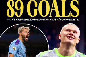 数据统计显示,哈兰德在英超已打进89粒非点球进球,队史仅次于157粒非点球进球的阿圭罗。
