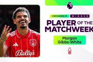 英超第33轮比赛,吉布斯-怀特打进3球,帮助诺丁汉森林4-1击败伯恩利,经过球迷的投票,他当选英超本轮最佳球员。
