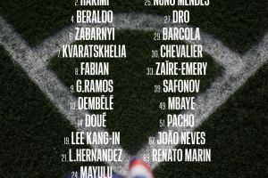 前锋:7-克瓦拉茨赫利亚、9-贡萨洛·拉莫斯、10-登贝莱、14-杜埃、29-巴尔科拉、49-姆巴耶