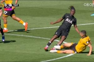 体育资讯04月25日讯 英超第34轮,热刺客战狼队。比赛上半场补时阶段,狼队中场特林达德飞铲连人带球放倒比苏马,主裁判泰勒向特林达德出示黄牌。