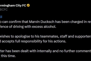 伯明翰官方:前锋杜克施因涉嫌酒驾被起诉,将对行为承担全部责任
