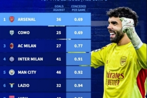 最佳防线,本赛季各项赛事场均丢球最少榜:阿森纳0.69球居首